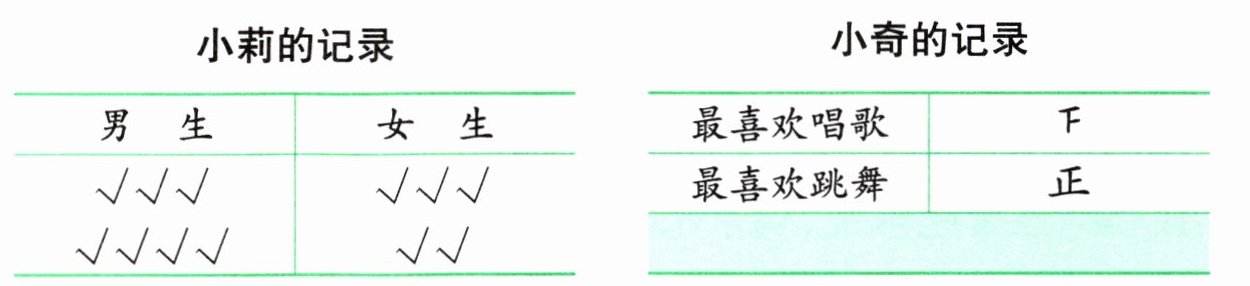 小莉和小奇分别按不同的内容对第一组同学进行调查并记录如下。小奇记录的结果有一行被遮住了,被遮住的可能是(