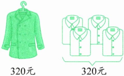 3. 买4件同样的衬衫要320元,买1件外套要320元。1件衬衫多少元?1件衬衫比1件外套便宜多少元?