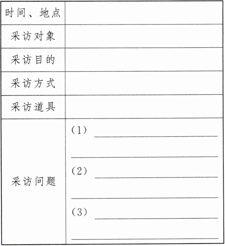 示例:时间、地点:周末,餐厅门口 采访对象:外卖员 采访目的:了解餐饮商家的食品安全问题 采访方式:直面采访 采访道具:笔记本、手机 采访问题:(1)你赞同自己家的孩子经常吃外卖吗? (2)为什么赞同/不赞同? (3)你认为平台餐厅干净卫生吗?存在什么样的问题?