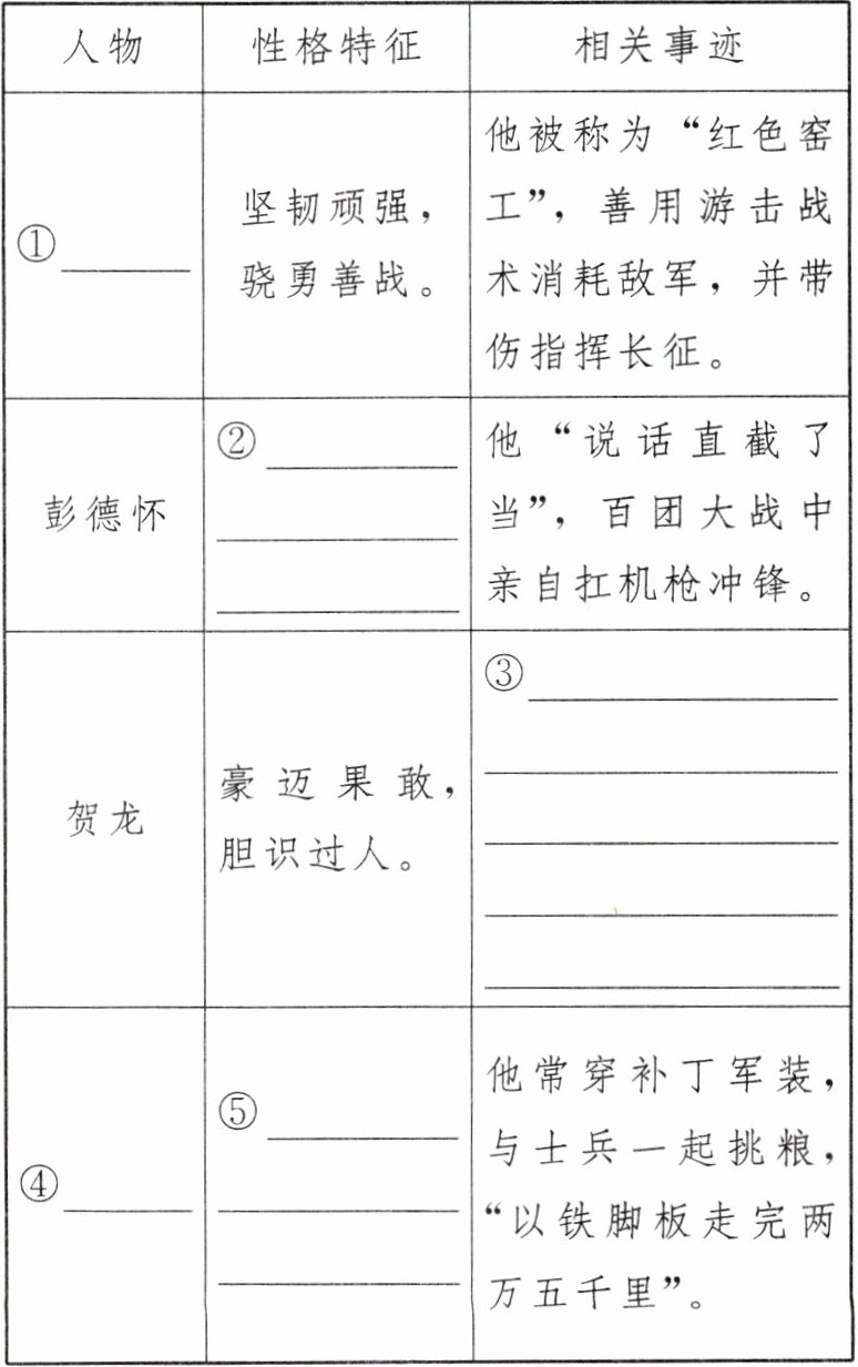 |①______|坚韧顽强,骁勇善战。|他被称为“红色窑工”,善用游击战术消耗敌军,并带伤指挥长征。|