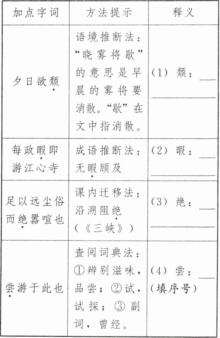 | 夕日欲颓 | 语境推断法:“晓雾将歇”的意思是早晨的雾将要消散。“歇”在文中指消散。 | (1)颓:______ |