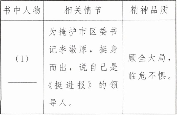 |(1)____|为掩护市区委书记李敬原,挺身而出,说自己是《挺进报》的领导人。|顾全大局,临危不惧。|