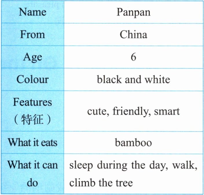 81. 动物园里有许多动物,但是你最喜欢的是大熊猫 Panpan,它非常可爱,所有人都喜欢它。请根据表格中的信息,写一篇80词左右的英语短文介绍一下它。