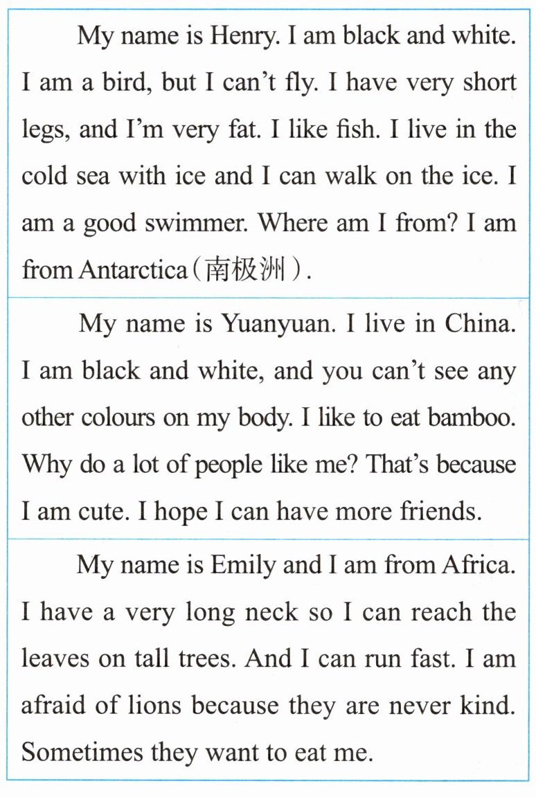 1. No, he/it can’t. 2. Henry. 3. Yuanyuan/She/It likes to eat bamboo. 4. Emily/She/It is from Africa. 5. Emily/She/It may be a giraffe.