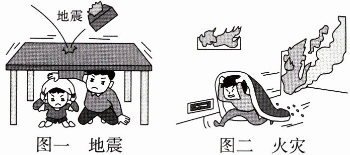 (2)地震自救:迅速跑到空旷地带;无法逃到室外的,在室内尽量躲避在空间相对狭小且坚固的地方;躲在课桌、椅子等坚固物体下面,待地震过后再有序撤离;等等。