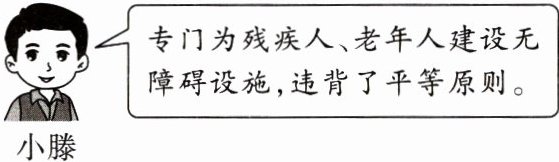 小滕同学的观点是错误的。①平等意味着同等情况同等对待,意味着权利义务平等,即平等地享有宪法和法律规定的权利,平等地履行宪法和法律规定的各项义务。②残疾人和老年人由于身体状况、年龄等方面的原因,出行不方便,为他们进行无障碍环境建设,能够让他们更好地参与和融入社会,平等地共享发展成果。③这种差别对待的做法,并没有违反平等原则和精神,相反,是为了让他们获得实实在在的平等。