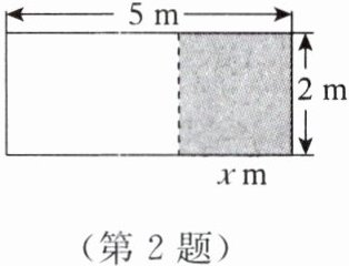 2. 如图,一块长为$5\mathrm{m}$、宽为$2\mathrm{m}$的长方形木板,现要在长边上截去长为$x\mathrm{m}$的一部分,则剩余木板的面积(空白部分)$y(\mathrm{m}^{2})与x(\mathrm{m})$之间的关系式为(