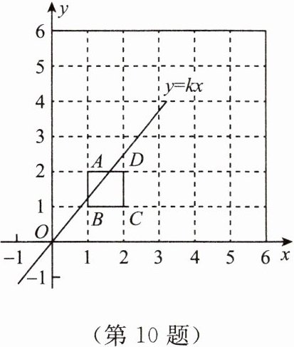 10. 将 $ 6 × 6 $ 的正方形网格放置在如图所示的平面直角坐标系中,每个小正方形的顶点称为格点,每个小正方形的边长都是 1,正方形 $ ABCD $ 的顶点都在格点上。若直线 $ y = kx(k \neq 0) $ 与正方形 $ ABCD $ 有公共点,则 $ k $ 不可能是(