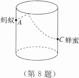 8.【综合与实践】如图,圆柱形玻璃杯高 $14cm$,底面周长为 $32cm$,在杯内壁离杯底 $5cm$ 的点 $C$ 处有一滴蜂蜜,此时一只蚂蚁正好在杯外壁,离杯上沿 $3cm$ 的点 $A$ 处,则蚂蚁从外壁 $A$ 处到内壁 $C$ 处的最短路程是多少?(杯壁厚度忽略不计)