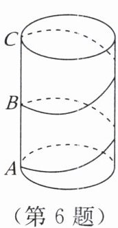 6. 如图,有一个圆柱形礼盒,高 $18cm$,底面周长为 $12cm$,现准备在礼盒表面粘贴彩带作为装饰,若彩带一端粘在 $A$ 处,另一端绕礼盒侧面 $2$ 周后粘贴在 $C$ 处($B$ 为 $AC$ 的中点),则彩带最短为(