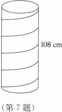 7. 为筹备晚会,同学们设计了一个圆柱形灯罩,底面漆成白色,侧面缠上红色油纸,如图所示。已知圆柱的高为 $108cm$,其横截面的周长为 $36cm$,如果在其侧面缠上 $4$ 圈油纸,最少应裁剪多长的油纸?(油纸厚度忽略不计)