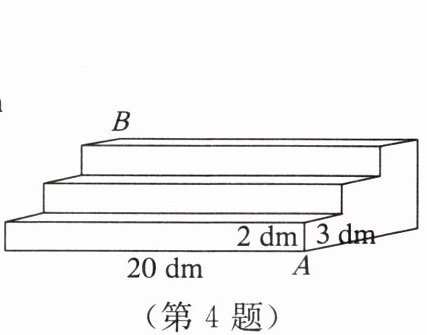 4. 如图所示的是一个三级台阶,它的每一级的长、宽、高分别为 $20dm$,$3dm$,$2dm$,$A$ 和 $B$ 是这个三级台阶的两个相对的端点,点 $A$ 有一只蚂蚁,想到点 $B$ 去吃可口的食物,则蚂蚁沿着台阶面到点 $B$ 的最短路程是