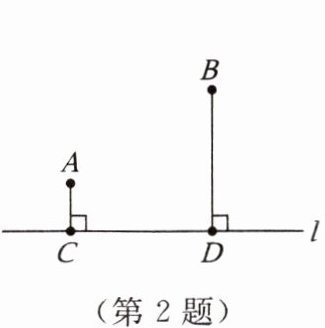 2. 如图,要在河边$l$上修建一座水泵站,分别向$A$,$B$两个村庄送水,已知$A$,$B两村到河边的距离分别为AC = 1km和BD = 3km$,且$C$,$D两点相距3km$,则所铺设的水管至少是(