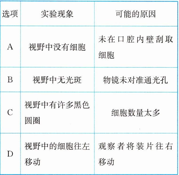 4. 用显微镜观察经染色的人的口腔上皮细胞临时装片,观察到的实验现象与原因分析不吻合的一项是(