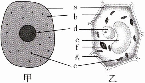 (1)图乙细胞具有[g]细胞壁、[f]叶绿体和[e]液泡,这是植物细胞所特有的。因此,图乙是植物细胞结构示意图,图甲是动物细胞结构示意图。