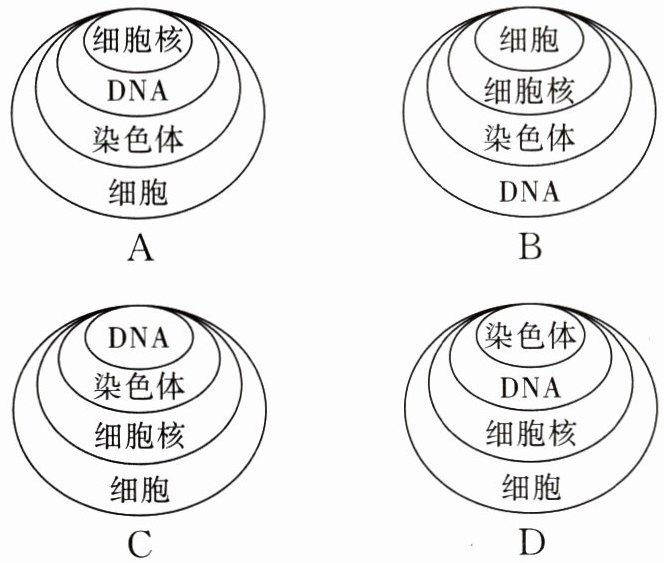 2. 下列图形中,能恰当表示细胞、细胞核、染色体、DNA 之间的层次关系的是(