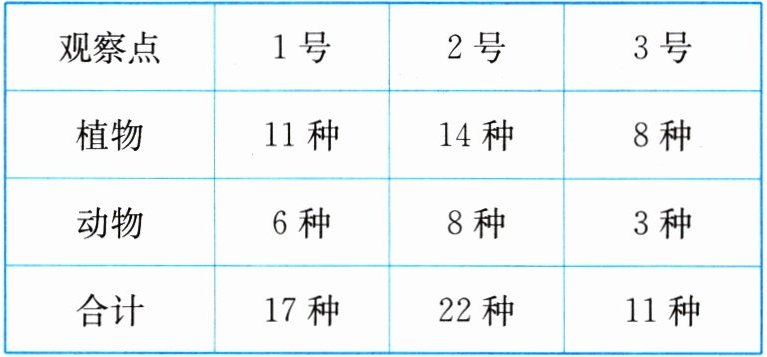(2)由数据表可知,1号观察点共有17种生物,2号观察点共有22种生物,3号观察点共有11种生物。作图如下: