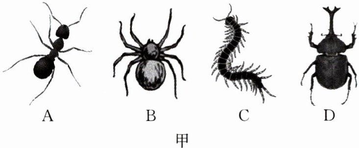 (1)科学研究表明,昆虫(成虫)具有三对足。图甲是同学们在2号观察点通过拍照记录到的四种无脊椎动物的成虫,据图判断,可能是昆虫的是