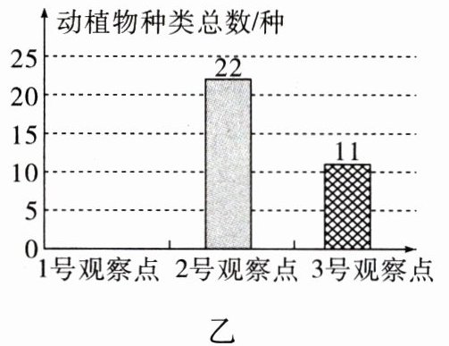(2)全班同学在三个观察点的记录数据如下表所示,请根据表中数据,在图乙中补充绘制1号观察点动植物种类总数的条形统计图。
