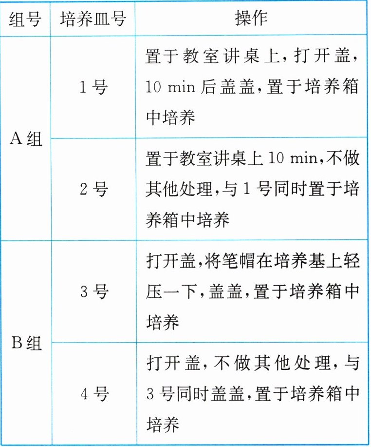 (1)1号和2号用于检测教室的空气,变量是教室空气;3号和4号用于检测笔帽,变量是笔帽。其中2号和4号起对照作用。
