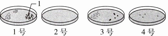 (3)图中1号和3号有大量细菌和真菌,2号几乎没有,4号有少量细菌和真菌。说明教室的空气和笔帽上都有细菌和真菌。真菌菌落较大,真菌中的霉菌形成的菌落常呈绒毛状、絮状或蜘蛛网状。菌落1呈黑色、绒毛状,应该是真菌菌落。