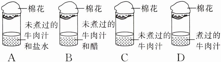 3.C 细菌和真菌的生活需要一定的条件,如水、适宜的温度、有机物等。盐水会抑制细菌、真菌的生长和繁殖,因此,A装置内微生物数量较少;醋有杀菌作用,也能抑制细菌、真菌的生长和繁殖,因此,B装置内微生物数量较少;未煮过的牛肉汁里细菌、真菌较多,营养物质丰富,细菌、真菌生长和繁殖较快,因此,C装置内微生物数量最多;煮过的牛肉汁经过高温杀菌,里面的细菌、真菌数量较少,繁殖较慢,因此,D装置内微生物数量较少。