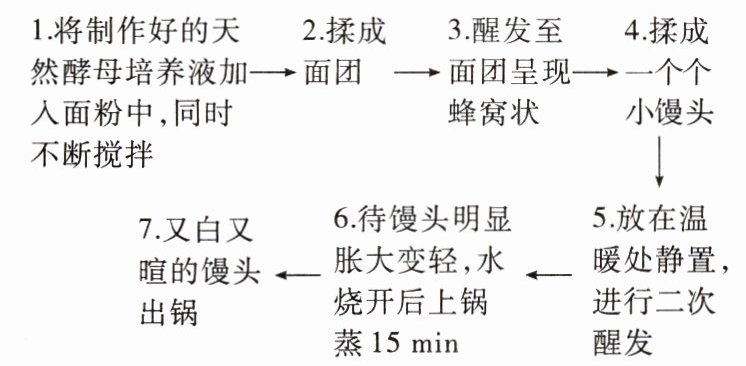 1.将制作好的天然酵母培养液加入面粉中,同时不断搅拌→2.揉成面团→3.醒发至面团呈现蜂窝状→4.揉成一个个小馒头→5.放在温暖处静置,进行二次醒发→6.待馒头明显胀大变轻,水烧开后上锅蒸15 min→7.又白又暄的馒头出锅