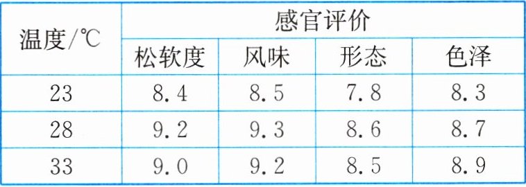 (4)品鉴与反思:小楠在醒发面团和馒头时,还做了不同发酵温度的对照实验,最后邀请同学们一起品尝、比较和评价,结果汇总如下表。