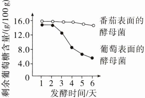 (2)葡萄 发酵2天后,葡萄表面酵母菌和葡萄糖溶液的混合液中葡萄糖含量比番茄表面酵母菌和葡萄糖溶液的混合液中葡萄糖含量低