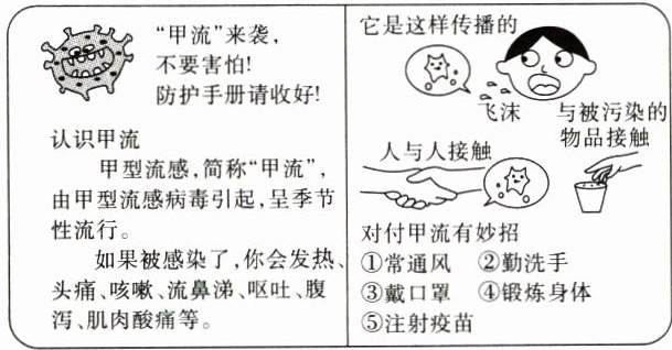 3. 某校针对春季高发的甲流,开展了“制作传染病校园防护手册”的实践活动。小明制作的手册如图所示,请结合手册内容,回答相关问题。