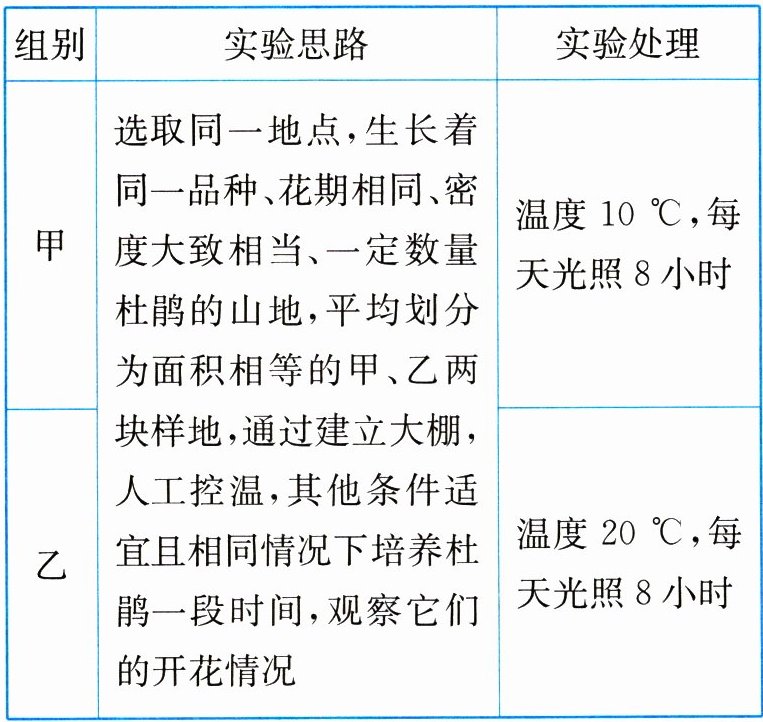 杜鹃开花。② 若甲组杜鹃开花早于乙组,则说明在一定温度范围内,高温会抑制杜鹃开花。