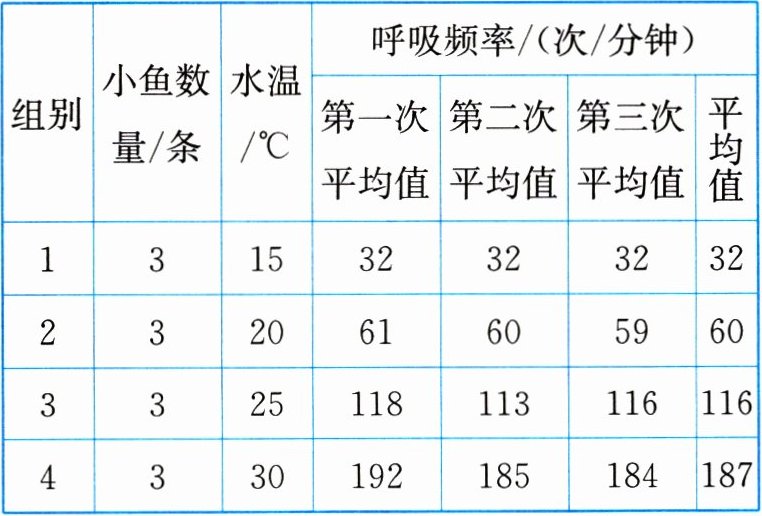 (4)减小误差,使实验结果更准确 水温对小鱼的呼吸频率有影响(或在一定范围内,水温越高,小鱼的呼吸频率越快)