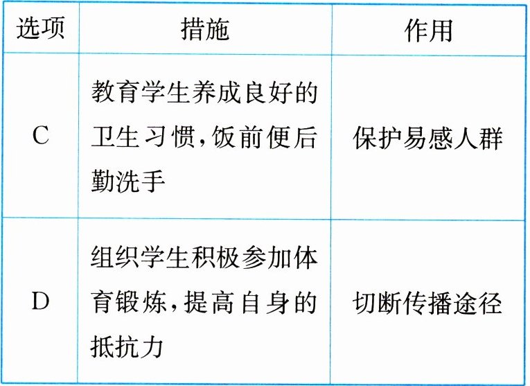 4. (2024宜宾中考)学校为了防止流感病毒的传播采取了多项措施。下列措施和作用对应关系恰当的是(