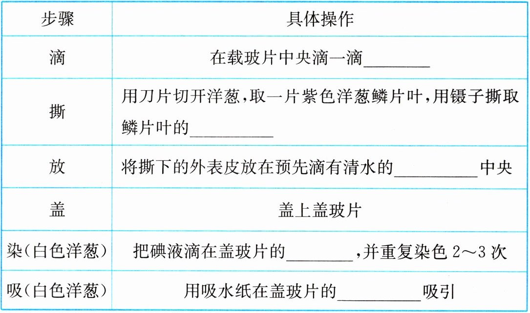 |撕|用刀片切开洋葱,取一片紫色洋葱鳞片叶,用镊子撕取鳞片叶的____|