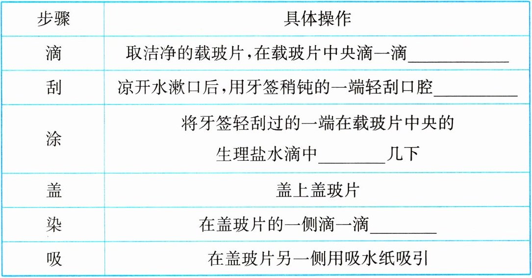 |涂|将牙签轻刮过的一端在载玻片中央的生理盐水滴中______几下|
