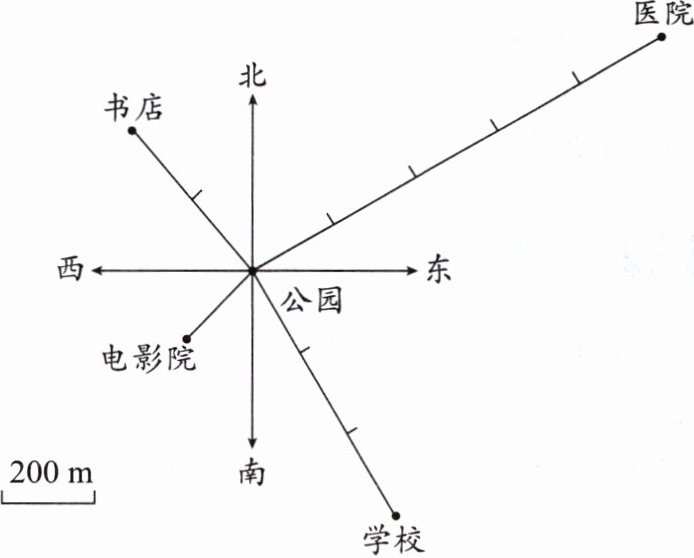 由图例可知图上每一段“——”表示 $200m$,医院到公园的距离是(