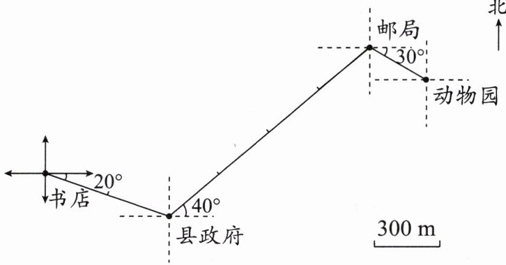 动物园→邮局:方向为西偏北$30^{\circ}$,路程$300m$。