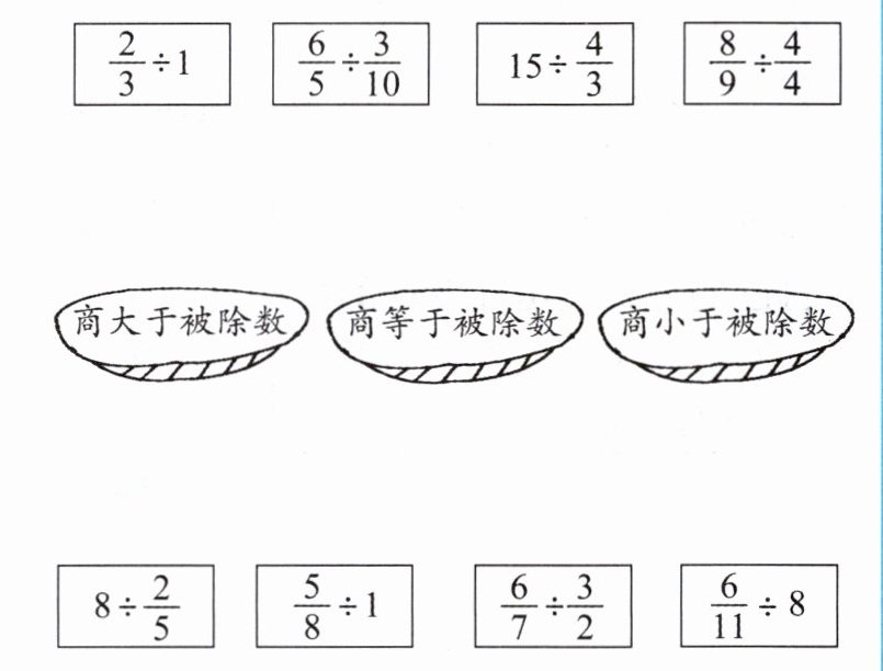 $\frac{2}{3} ÷ 1$ $\frac{6}{5} ÷ \frac{3}{10}$ $15 ÷ \frac{4}{3}$ $\frac{8}{9} ÷ \frac{4}{4}$