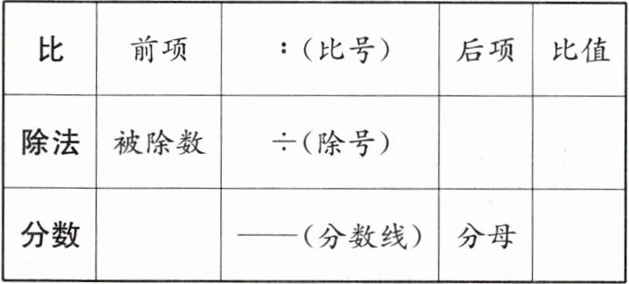 | 比 | 前项 | :(比号) | 后项 | 比值 |