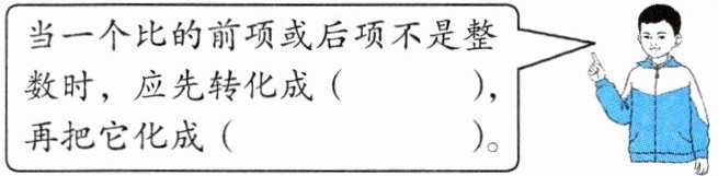 2.求比值用除法,结果是一个数;化简比是根据比的基本性质进行化简,结果是一个比,可以写成分数,但不能写成小数或整数。