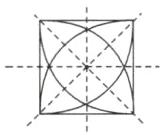 以正方形的每条边为直径,用圆规在正方形内画四个半圆,使半圆弧朝向正方形中心,形成四瓣图案。