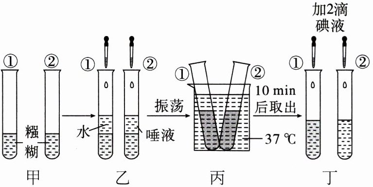 (3)图丁中的______号试管加碘液后会变蓝色,原因是糨糊的主要成分是______,它遇碘会变蓝。______号试管加碘液后不变蓝色,说明______。