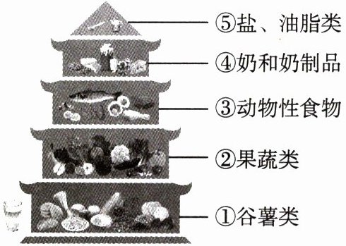 (2)根据平衡膳食宝塔的建议,每日摄取量最多的应为第①层食物,因为该层食物富含______,能满足人体对能量的需求;摄取量最少的应为第⑤层食物,因为该层食物富含______,过量摄取易在人体内贮存导致肥胖。