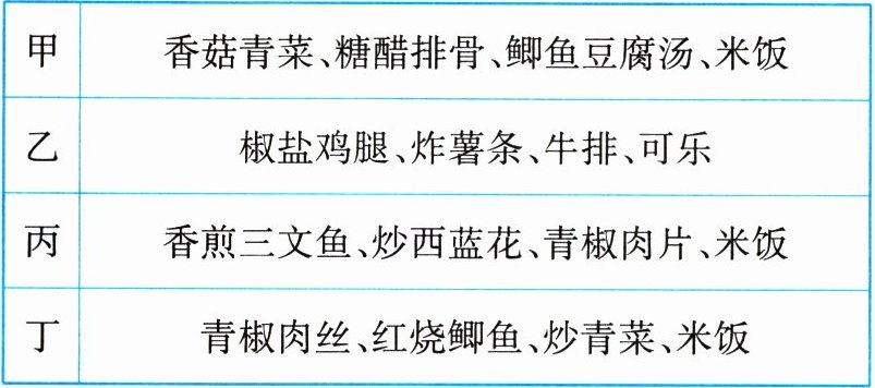 2. 学习了合理膳食有关内容后,4名同学设计的午餐食谱如表所示,其中不合理的是( )