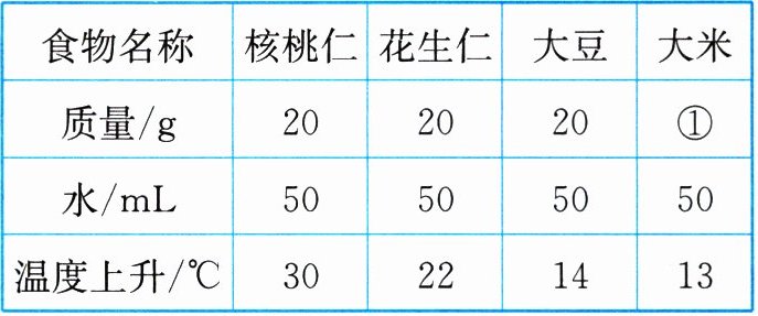 10. 在课后服务活动中,某班同学为了测定食物中的能量,选择核桃仁、花生仁、大豆和大米进行探究,结果如表所示,请据此回答下列问题。