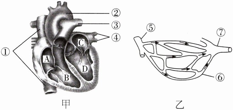 (2) 图甲中,A的结构名称是______,A和B之间的瓣膜的作用是______。