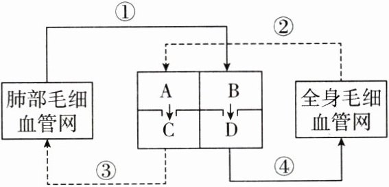8. (2024·南充中考)下图为人体血液循环简图,其中A~D表示心脏的四个腔,①~④表示血管。下列说法正确的是( )