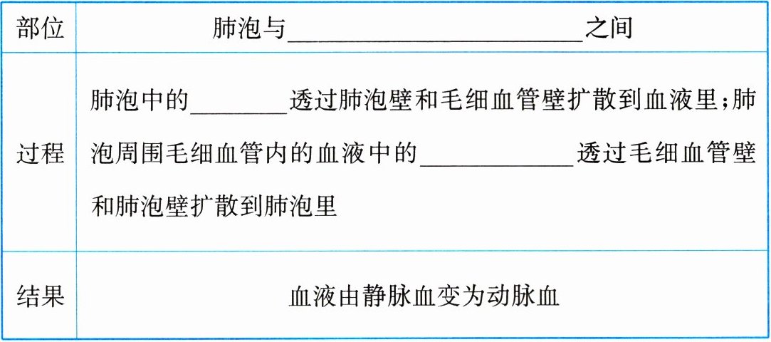 |过程|肺泡中的______透过肺泡壁和毛细血管壁扩散到血液里;肺泡周围毛细血管内的血液中的______透过毛细血管壁和肺泡壁扩散到肺泡里|