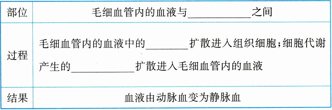 |过程|毛细血管内的血液中的______扩散进入组织细胞;细胞代谢产生的______扩散进入毛细血管内的血液|