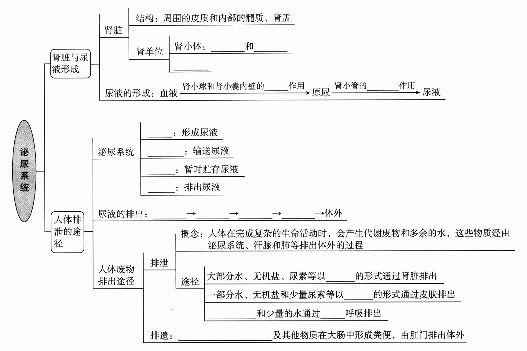 - 尿液的形成:血液$\xrightarrow{肾小球和肾小囊内壁的$_________$作用}原尿\xrightarrow{肾小管的$_________$作用}$尿液